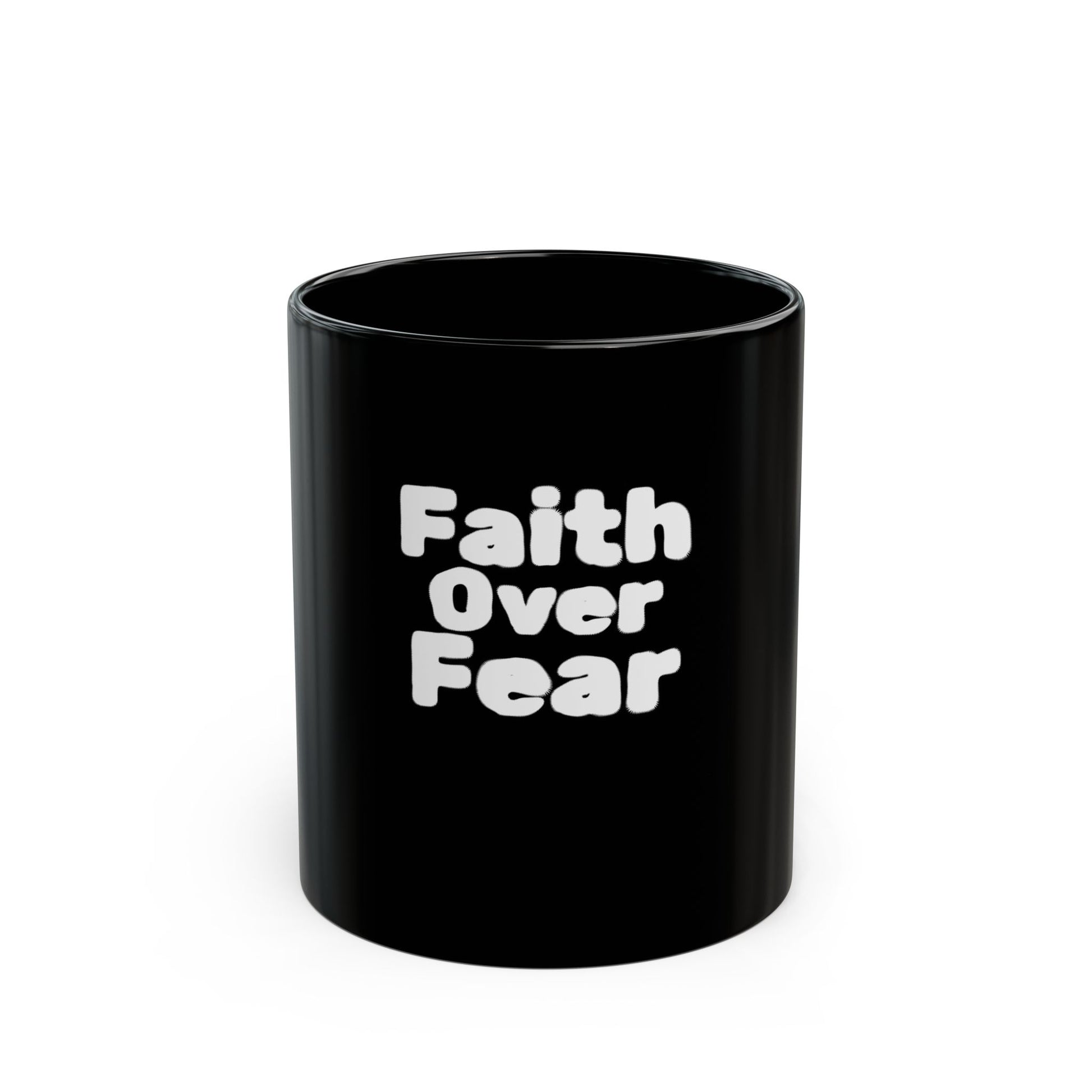 This glossy black ceramic mug holds your morning courage in bold, simple strokes. A chunky, rounded typeface reads “Faith Over Fear” in crisp white against a deep black backdrop — a quiet, steady reminder to choose trust over worry with every sip. The comfortable C-handle and two size options let you settle in with coffee, tea, or cocoa while that message centers you for the day. It cleans easily in the dishwasher and warms safely in the microwave, so the routine stays effortless while the sentiment stays present.