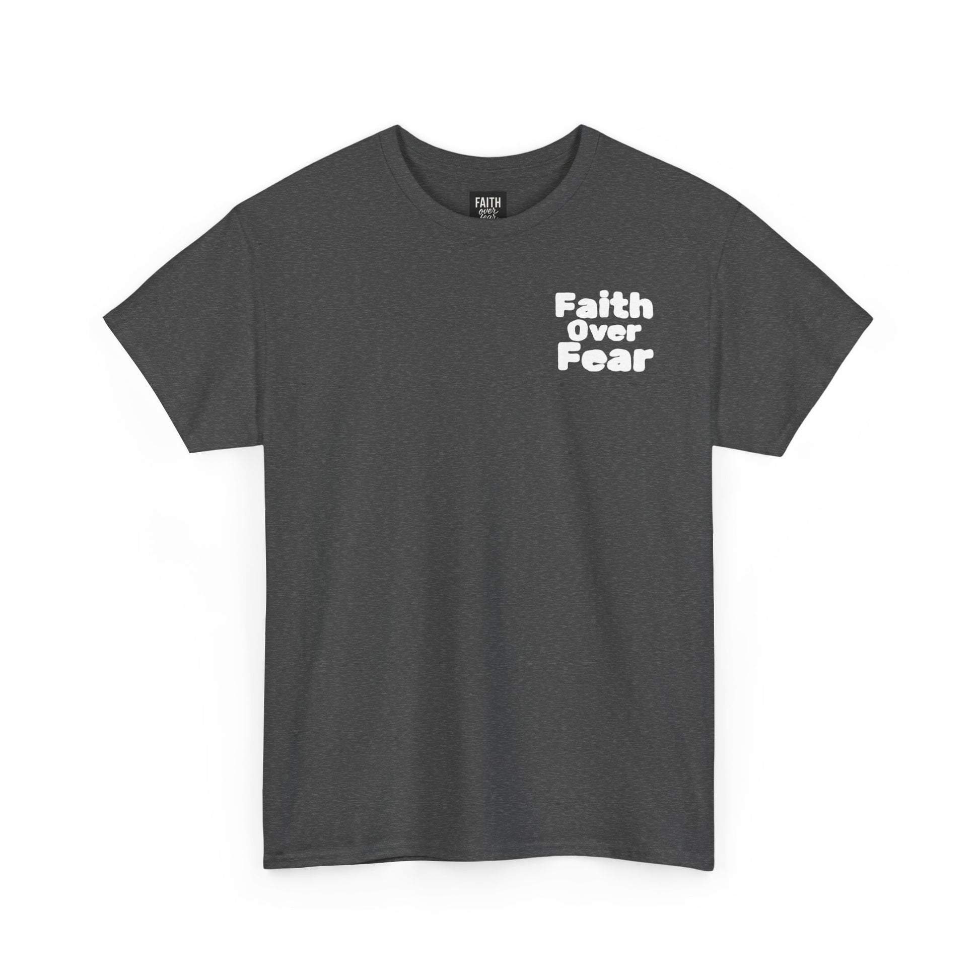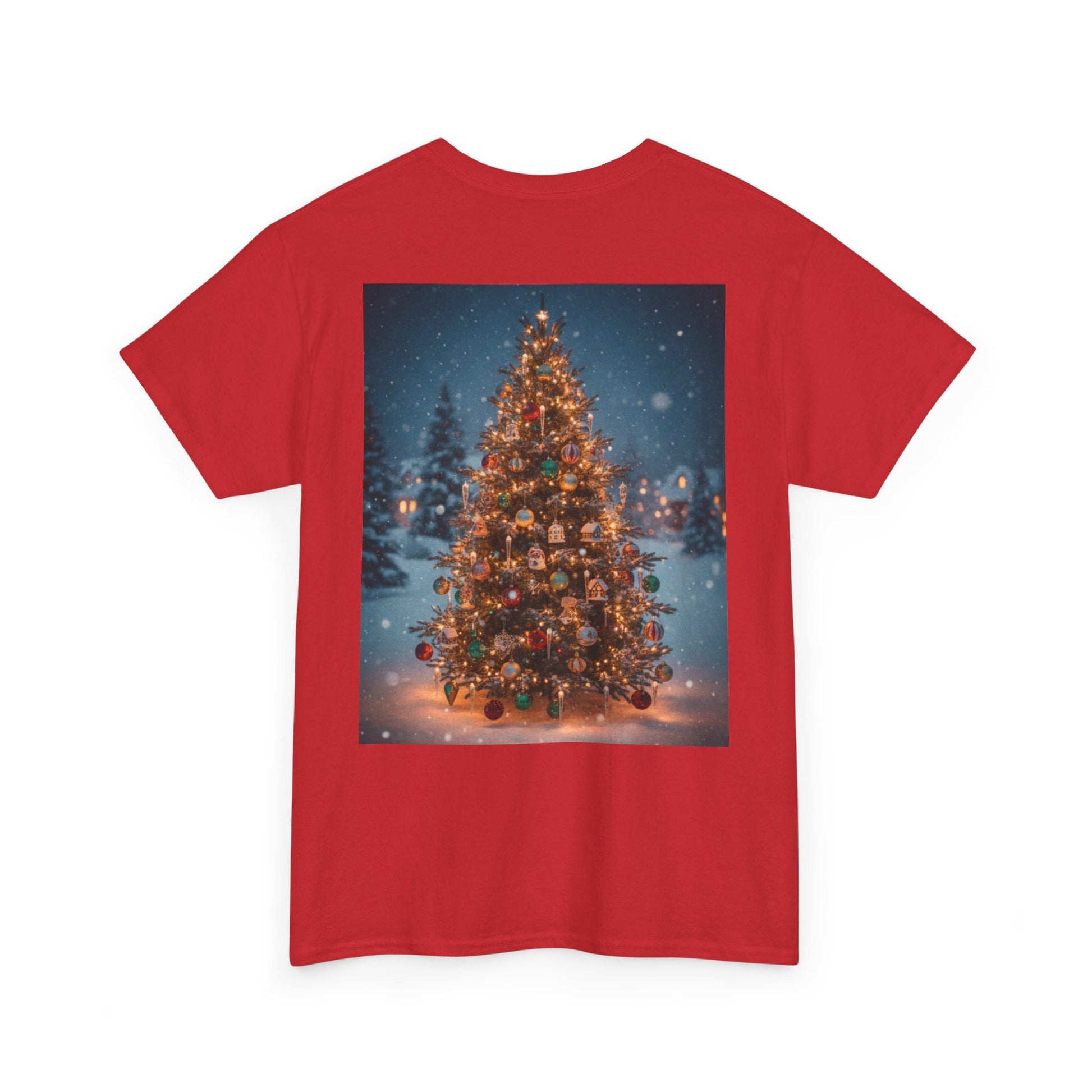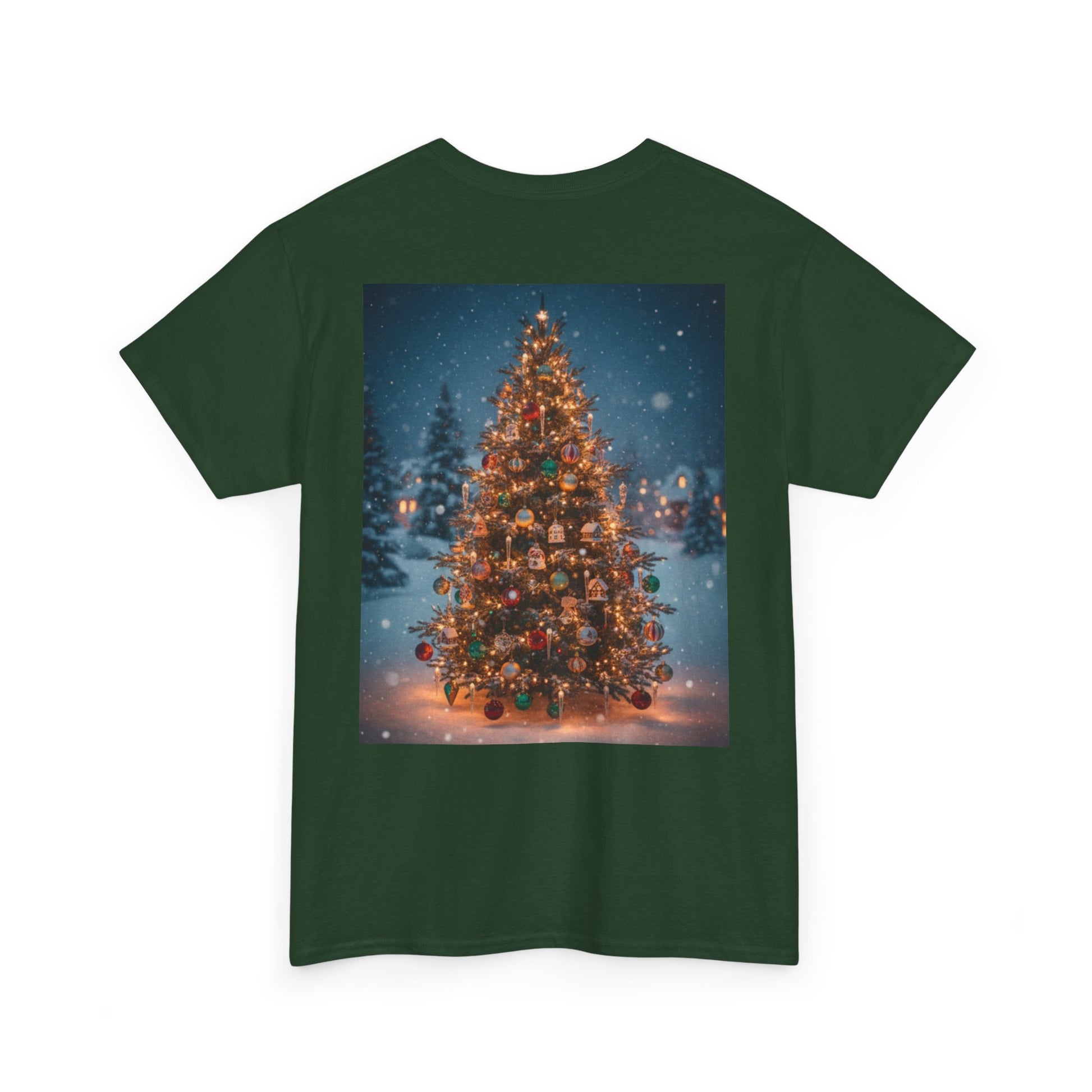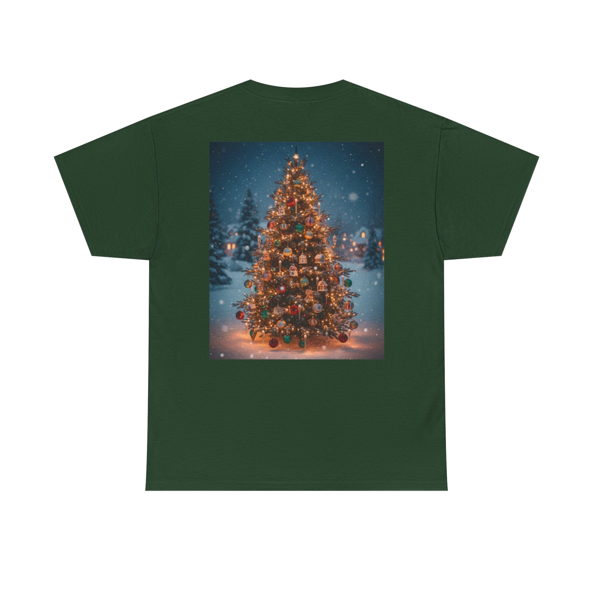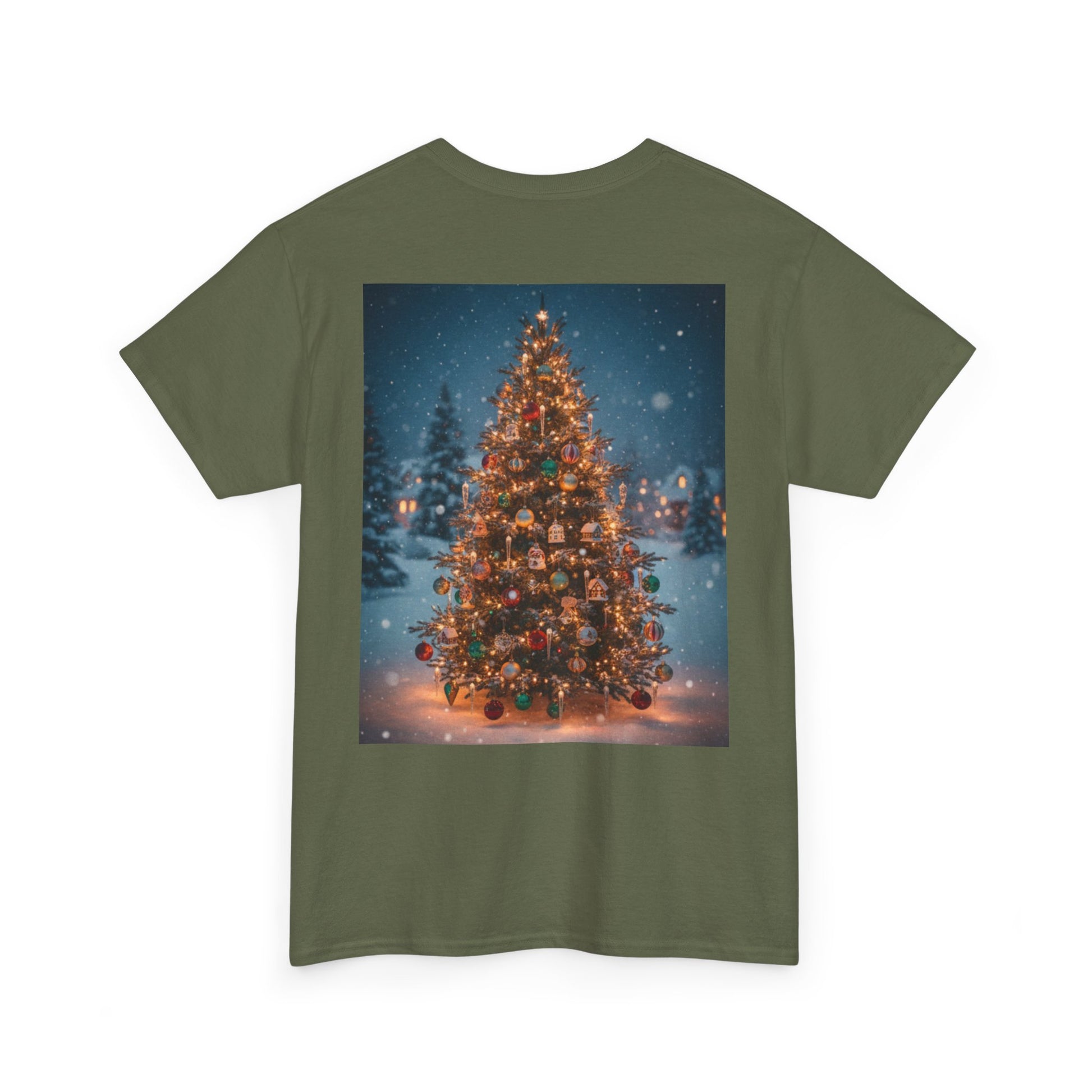 This lightweight, classic-fit tee carries a quiet winter warmth. On the chest, a small, confident ‘Faith Over Fear’ script sits over the heart. On the back, a softly glowing, snow-dusted Christmas tree scene spills color and light — warm bulbs, frosted branches, and a calm, snowfall evening beyond. It feels like stepping out of a car onto a pine-lined street after a long drive: cool air, the smell of cedar, and the hush of holiday lights. Wear it to neighborhood carol nights, low-key family gatherings, or those evenings spent stringing lights and listening to vinyl. The simple front message and the illustrated back create a balance of subtle conviction up front and full, nostalgic cheer behind — a shirt that settles into your life and the season rather than shouting for attention.
